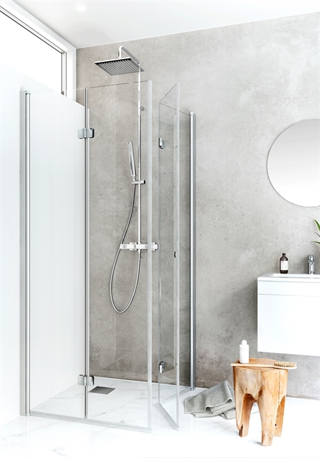 Duschhörn med vikbara dörrar med klart glas som frigör yta och gör det möjligt att skapa en smart duschlösning för det lilla badrummet där ett traditionellt hörn kan vara svårplacerat. Den vikbara dörren kan lätt fällas in mot väggen när den inte används och skapar en praktisk duschlösning även om WC eller badrumsmöbler är placerade nära duschen. Duschhörnet är stabilt med väggprofiler i eloxerad eller svartlackerad aluminium som kan monteras med skruv eller limbrickor. Det har en patenterad lösning för enkel installation och justering, Hafa's InstaQuick™. Duschdörrarna har lyftgångjärn för att de inte skall ta i golvet vid öppning och är vändbara så du kan välja hur de skall installeras. Duschdörren kan kombineras med andra dörrar och väggar i IglooPro-serien. 6 mm härdat säkerhetsglas.
